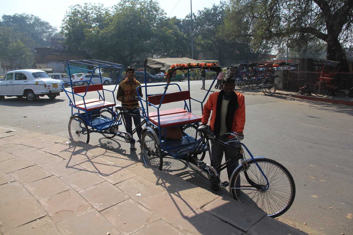 Tour guide 租了 2 部人力車 + driver,要先議價,INR 250 for 1 hour trip for 2 rickshaws + drivers,Tour guide 跟司機說明不可以私下問我們拿 tips。