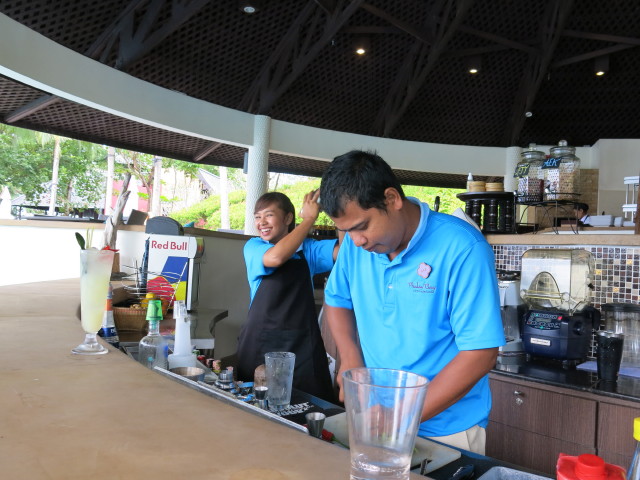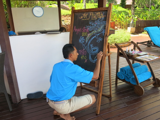 27/10/201423/07/2018 Plai Fah of Phulay Bay, a Ritz-Carlton Reserve Plai Fah, infinity pool bar,是我們去得最多的地方。 Poolside bar counter Thai style Mojito 下雨天也可以寫意 他每天也會在黑板上晝上 today special 友善又搞笑的 bartender Like Loading... Related