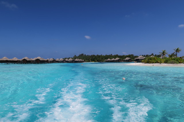 Shuttle boat crossing the lagoon transfer between Anantara Veli & Anantara Dhigu.