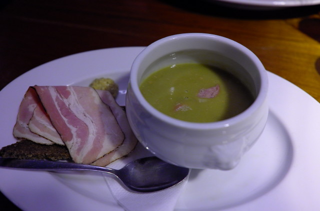 Pea-Soup with rye bread and smoked bacon