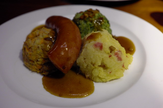 Combination of Hutspot, zuurkool- en boerenkoolstamppot served with a smoked sausage
