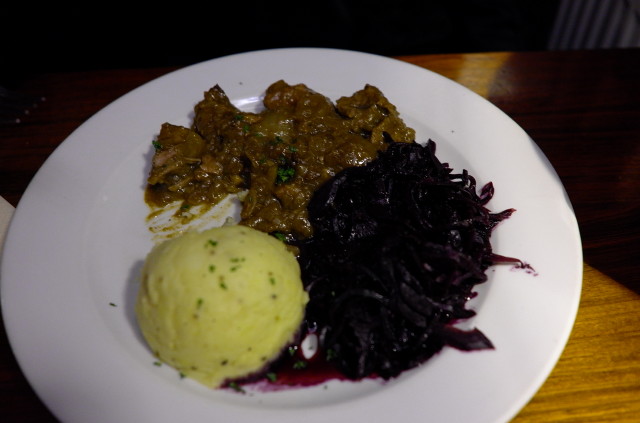 Savoury beef and onion stew served with red cabbage and mashed potatoes