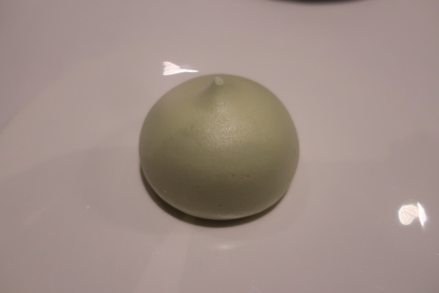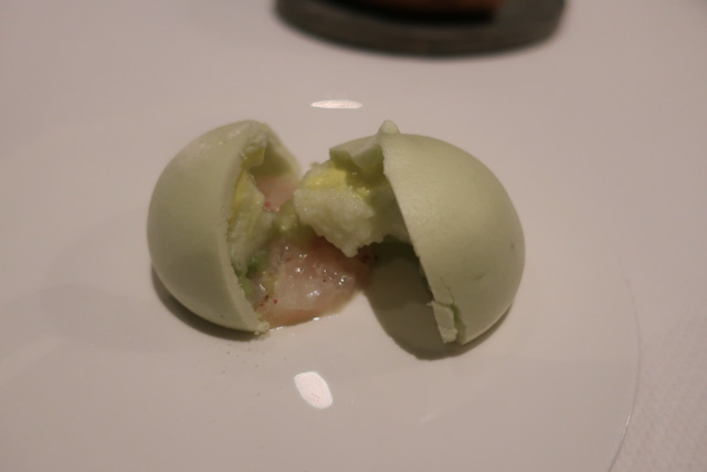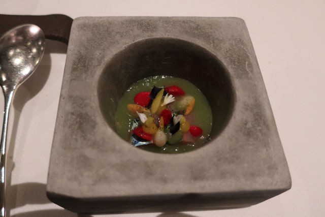 Raw, tapioca, cockles, preserved almonds, grape, plankton, pimento oil, green apple gazpacho