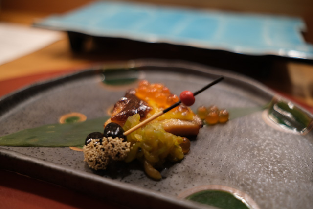 Appertizer – Chestnut shirae with crown daisy, mushroom; Ankimo pate with tabasco ponzu; King mackerel nanbanzuke; Grilled black cod; Miso cream cheese with cherry tomato; Fried lotus root chips